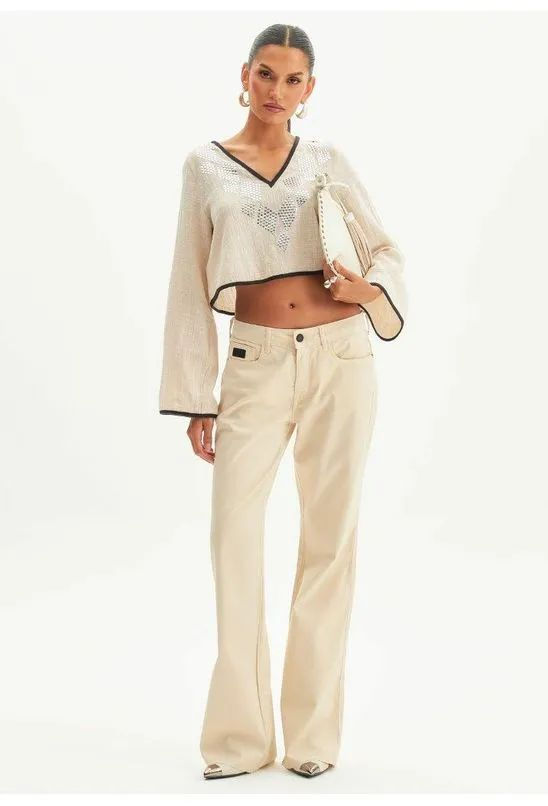 A calça de boca larga de sarja é uma peça de roupa versátil e elegante. Feita de tecido de sarja, que é durável e tem uma textura diagonal distintiva, essa calça possui uma característica notável: a boca larga. Isso significa que a parte inferior da calça é mais ampla, criando um visual mais solto e confortável.